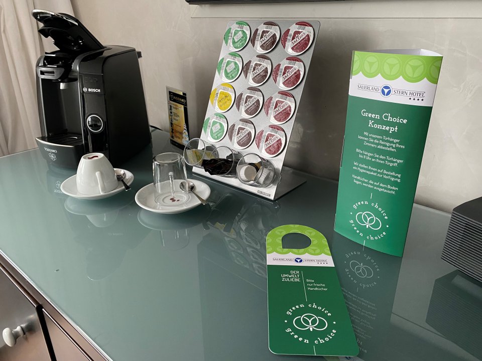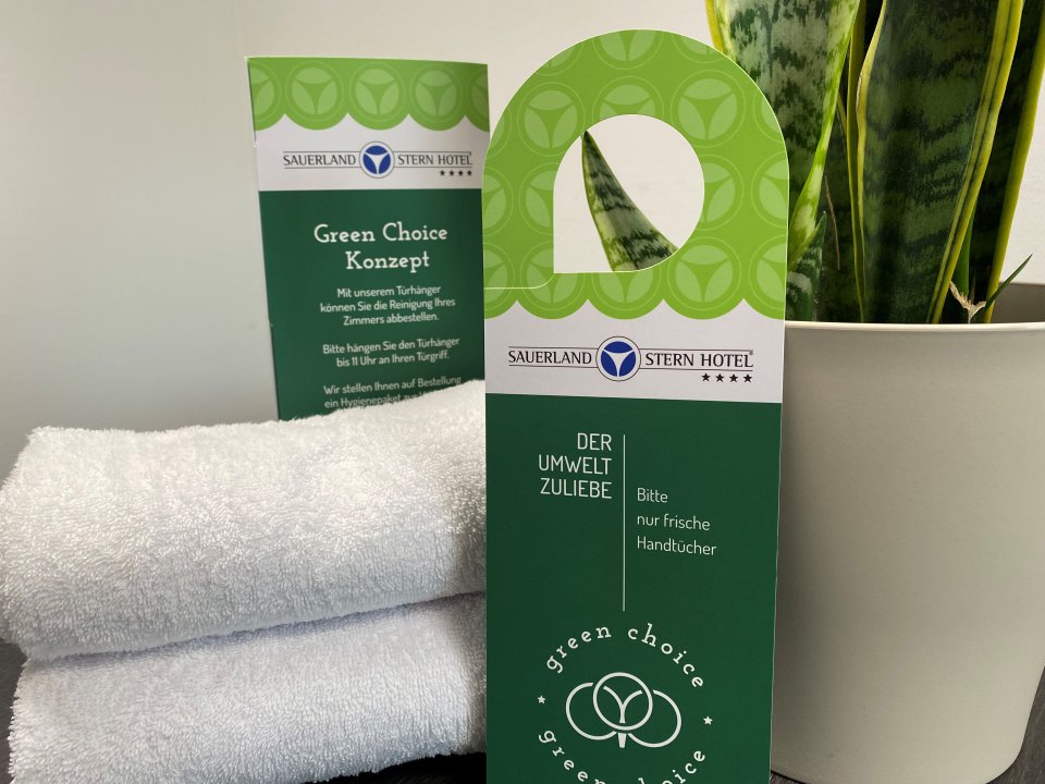 Zukünftig geben wir unseren Gästen mit unseren neuen "Green Choice Türhängern" die Wahl, auf Ihre tägliche Zimmerreinigung zu verzichten. Das Konzept ist ganz simpel: Der Gast muss nur seinen Green Choice Türhänger bis 11.00 Uhr an den Türgriff hängen und kann damit die Reinigung des Zimmers abbestellen. Es werden nur Handtücher ausgetauscht, die auf dem Boden liegen. Zusätzlich hat der Gast aber noch die Möglichkeit, ein kleines Hygienepaket zu bestellen.