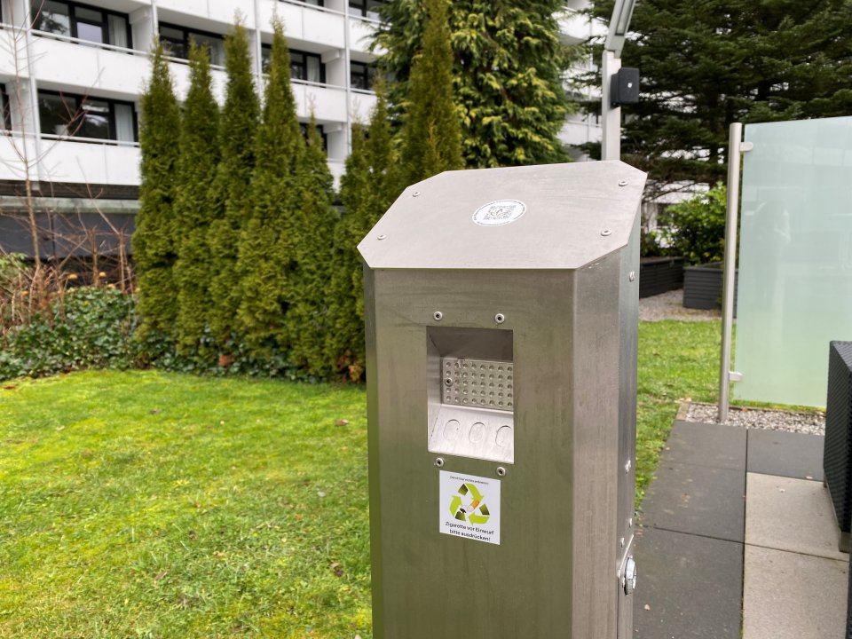 Ab sofort stehen an einigen unserer öffentlichen Bereiche wetterfeste Outdoor-Aschenbecher aus Edelstahl, wo Zigarettenkippen getrennt gesammelt werden können. Zudem haben wir auf allen unseren Zimmern mobile Taschenaschenbecher für unsere Gäste verteilt, die bequem in die Hosentasche passen und in unseren Outdoor-Aschenbechern entleert werden können. Diese gesammelten Kippen landen anschließend wieder bei Tobacycle und werden zu neuen Taschenaschenbechern recycelt.